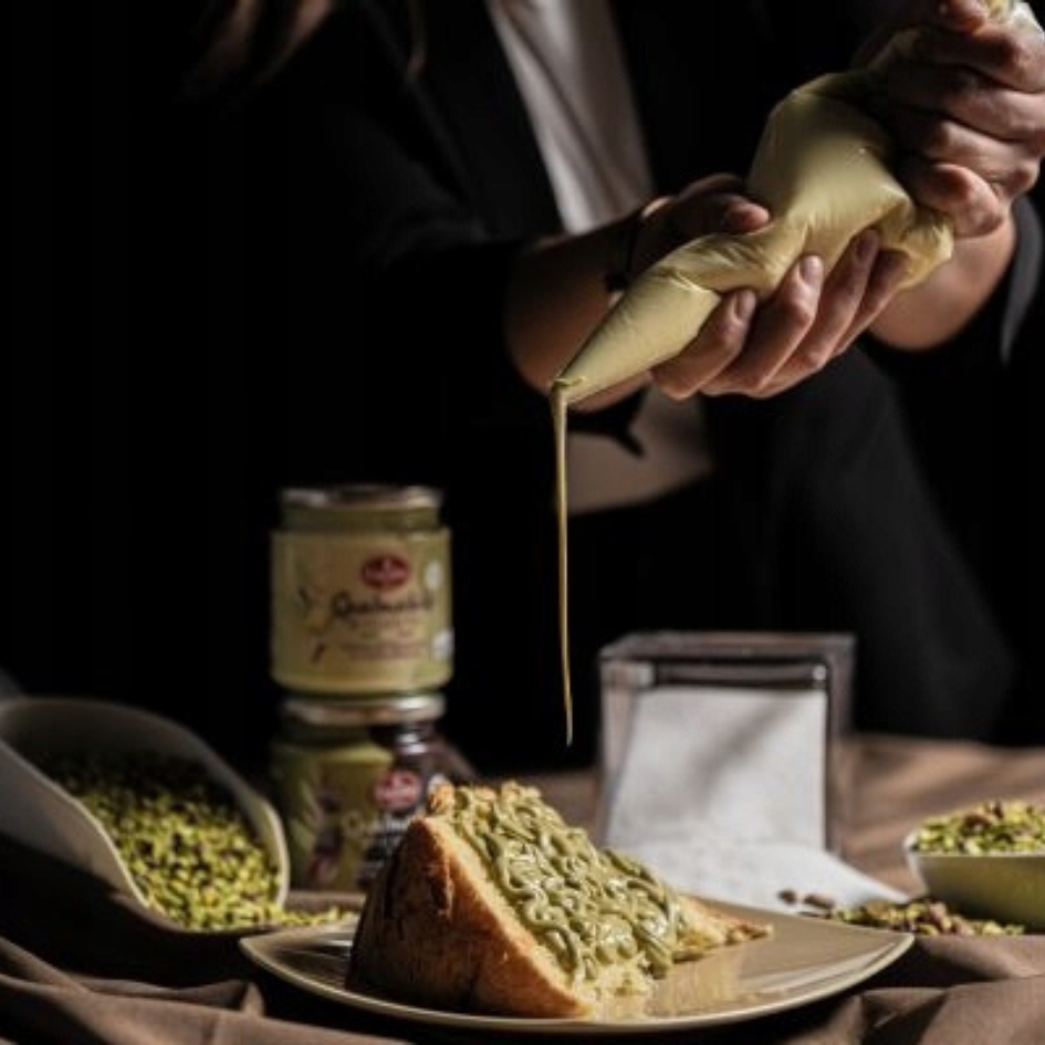 Valkoinen kreemi (sokeri, hydraamaton kasvirasva ja -öljyt (auringonkukkaöljy), herajauhe (maito), hyytelöitymisaine: muokattu tärkkelys, emulgointiaine: E322 soijalesitiini, E471, suola, aromit), Sisilian pistaasi 7%, pistaasi 38%. Saattaa sisältää muita pähkinöitä: manteli, hasselpähkinä. Pistaasin alkuperä: EI EU, EU.