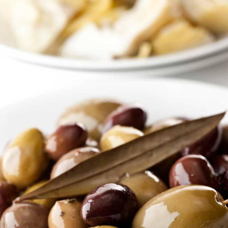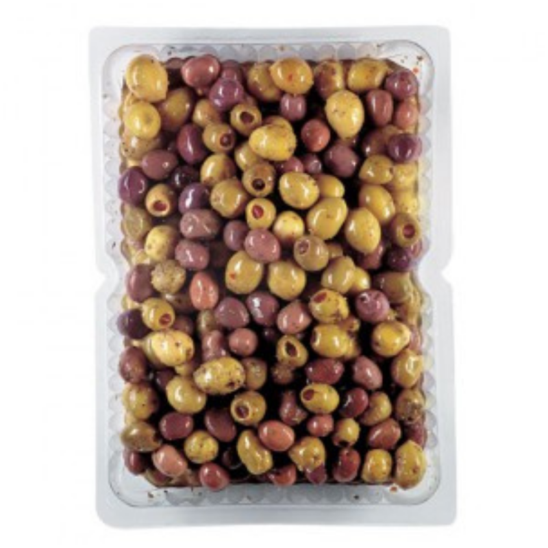 Oliver, paprikapasta (paprika, förtjockningsmedel: E401, E412, konserveringsmedel: E202), solrosolja, persilja, vitlök, chilipaprika, oregano, salt, surhetsreglerande medel: E330, E270, konserveringsmedel E202.
