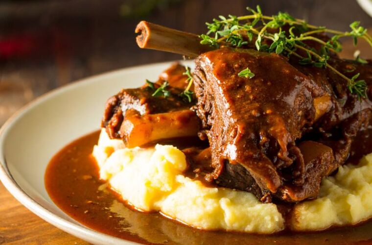 Peitä kannella ja hauduta pataa 160°C uunissa noin 2 tuntia, kunnes liha on mureaa. Lisää tarvittaessa hieman liha- tai kasvislientä, jos neste haihtuu liikaa. Poista kansi viimeisten 15–20 minuutin ajaksi, jotta kastike sakenee. Tarkista maku ja lisää tarvittaessa suolaa ja pippuria.