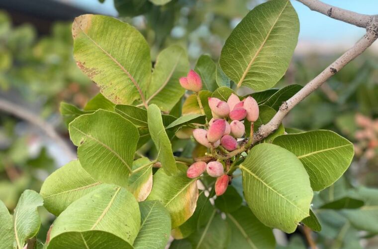 1. Kypsät, vaaleanpunaisina terttuina kasvavat pistaasipähkinät poimitaan käsin isoihin koreihin. Hanskojen käyttö on suotavaa, sillä poiminnan aikana ihoonsa saa nopeasti naarmujen lisäksi pihkamaisen tahmakerroksen.